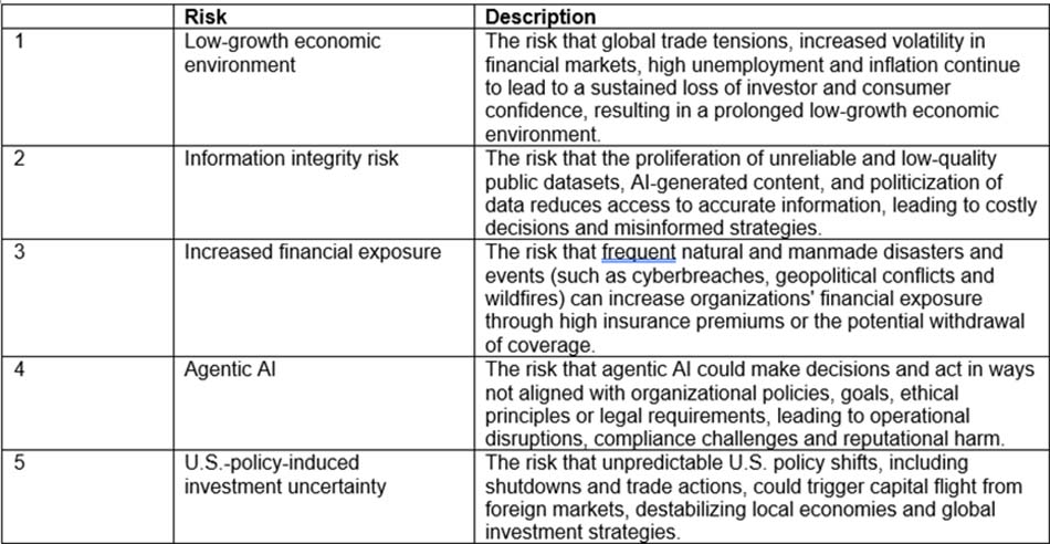 The low-growth economic environment, caused by global trade tensions and increased volatility in financial markets, continued to hold the top rank of emerging risks for the fourth quarter of 2025, according to Gartner.